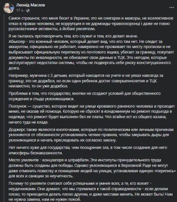 «С подобным положением вещей, когда добьют последнего добровольца, вас [уклонистов] все равно призовут в армию, причем сделают пушечным мясом» — пишет Маслов.