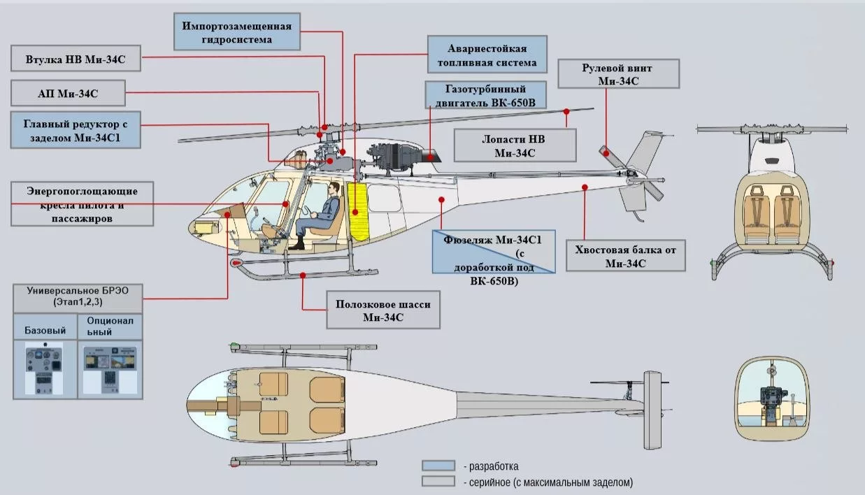 Наконец, лет пять назад «Вертолёты России» предприняли ещё одну попытку. Была составлена программа «Конкурентный лёгкий вертолёт» (КЛВ). Ми-34 предлагалось оснастить турбовальным двигателем АИ-450 (украинским – но времена были «ещё довоенные»). Позднее программу переименовали в «Перспективный лёгкий вертолёт» (ПЛВ) – уже с ВК-650В, и совет директоров «Вертолётов России» принял решение начать её реализацию.