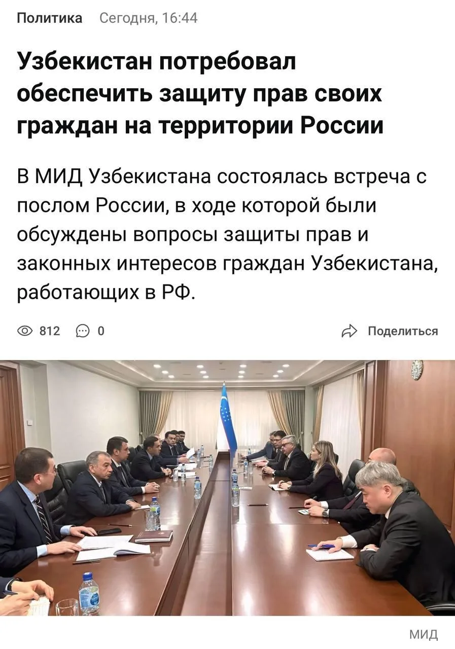 Несколько дней назад в ТЦ «Сити Молл» охранники задушили 24-летнего россиянина, после чего в регионах начались масштабные миграционные проверки. Узбекская сторона по этому поводу возмутилась и заявила о «недопущении нарушений прав граждан Узбекистана», подчеркнув, что защита должна распространяться как на законопослушных мигрантов, так и на нарушителей.