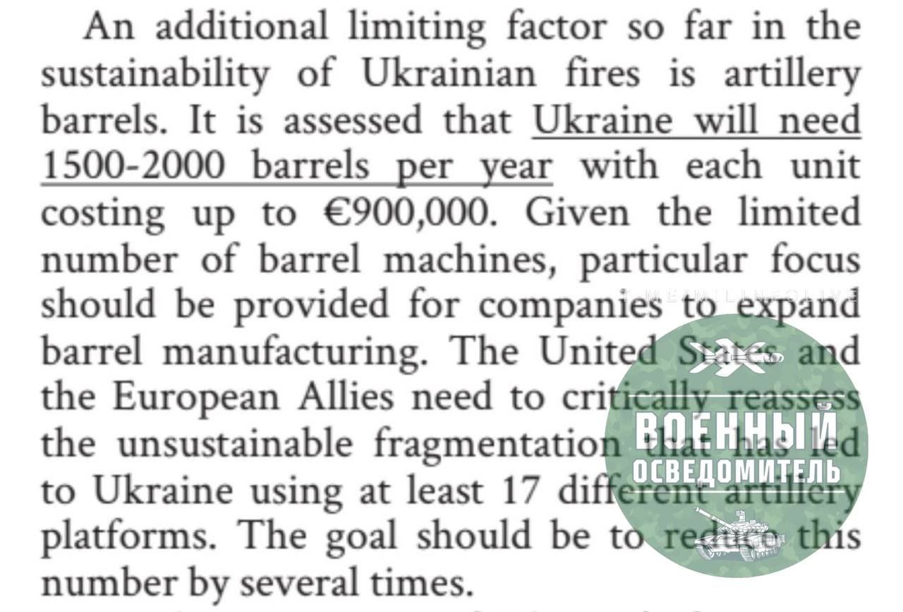 Во-первых, оценка потребности украинской артиллерии в новых стволах для артиллерийских систем на замену изношенным – 1500-2000 штук в год.