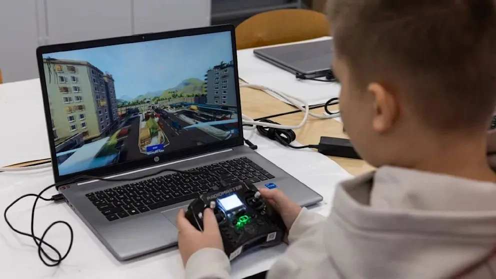 Симас надевает специальные очки. Он видит то, что видит мини-коптер, и ведёт дрон под препятствиями, над скамейками. Его пальцы управляют джойстиками с хирургической точностью. Крошечный дрон мчится по коридору — влево, вправо, вверх, вниз.