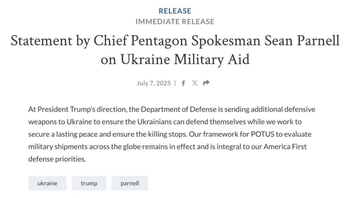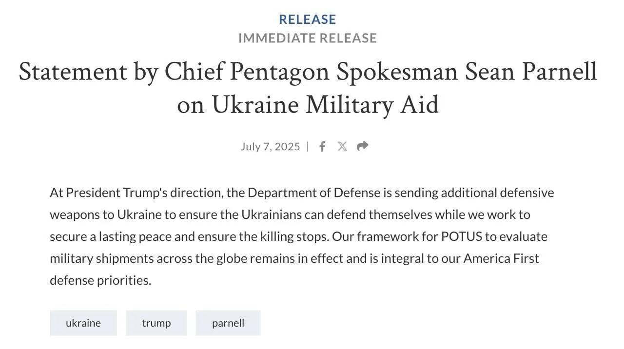 По указанию президента Трампа Министерство обороны направляет на Украину дополнительное оборонительное вооружение, чтобы украинцы могли защищать себя, пока мы работаем над обеспечением прочного мира и прекращением насилия. Наша система оценки поставок вооружений по всему миру для президента остаётся в силе и является неотъемлемой частью нашей оборонной стратегии «Америка прежде всего».»