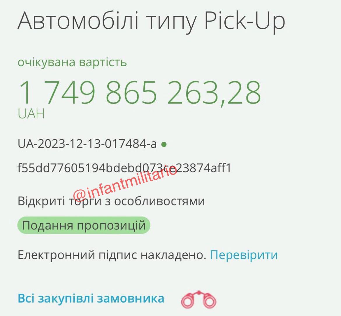 Согласно тендерной документации, ожидаемая стоимость закупки техники составляет 1,75 млрд гривен (примерно 46 тыс. долл. за один автомобиль). Пикапы должны быть поставлены заказчику до 15 марта 2024 года.