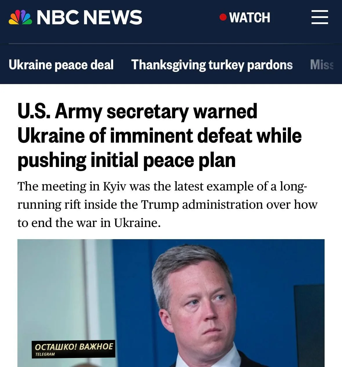 Дэниел Дрисколл заявил украинскому руководству, что ситуация на фронте критическая и ВСУ неизбежно потерпят поражение в борьбе с российскими силами, сообщает NBC со ссылкой на источники.