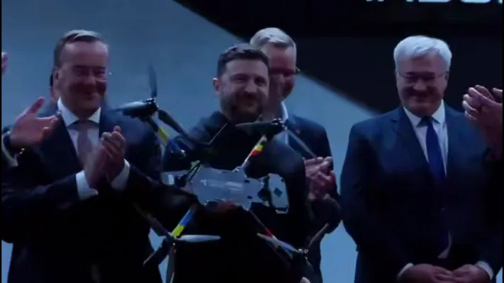 Зеленский сообщил, что уже посмотрел производственную линию и наблюдал первый полёт аппарата. По его словам, в 2026 году Украина получит 10000 таких дронов, произведённых в Германии.