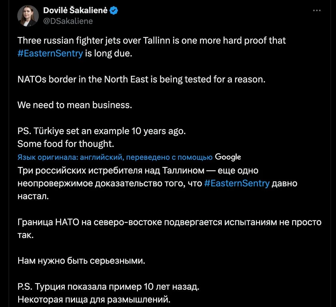 «Три российских истребителя над Таллином — ещё одно твёрдое доказательство того, что „Восточный страж“ давно назрел. Северо-восточная граница НАТО проверяется не просто так. Мы должны действовать всерьёз. Турция показала пример 10 лет назад. Есть над чем задуматься»,