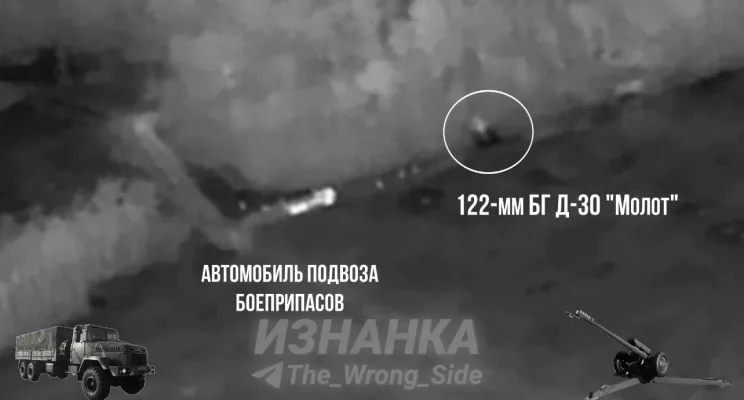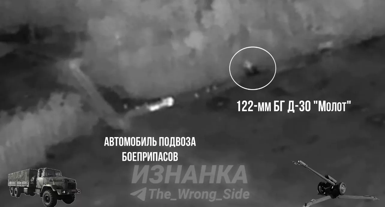 Воздушной разведкой был обнаружен автомобиль подвоза боеприпасов ВСУ, двигающийся в район огневой позиции 122-мм буксируемой гаубицы Д-30.