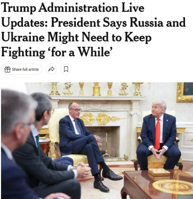 - Хотя в ходе своей предвыборной кампании Трамп неоднократно обещал закончить войну за 24 часа, спустя несколько месяцев после возвращения в Белый дом он предпочитает говорить о ней как сторонний наблюдатель, отмечает NYT.