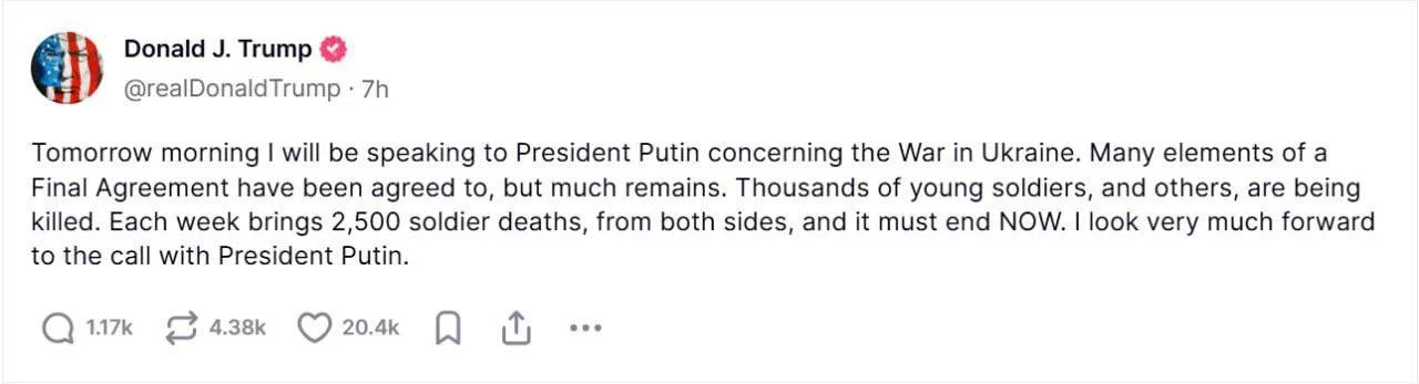 «Утром я буду говорить с президентом Путиным о войне в Украине. Многие элементы окончательного соглашения были согласованы, но многое еще предстоит сделать. Тысячи молодых солдат и других людей погибают. Каждую неделю погибает 2500 солдат с обеих сторон, и этому должен быть положен конец СЕЙЧАС. Я с нетерпением жду разговора с президентом Путиным».