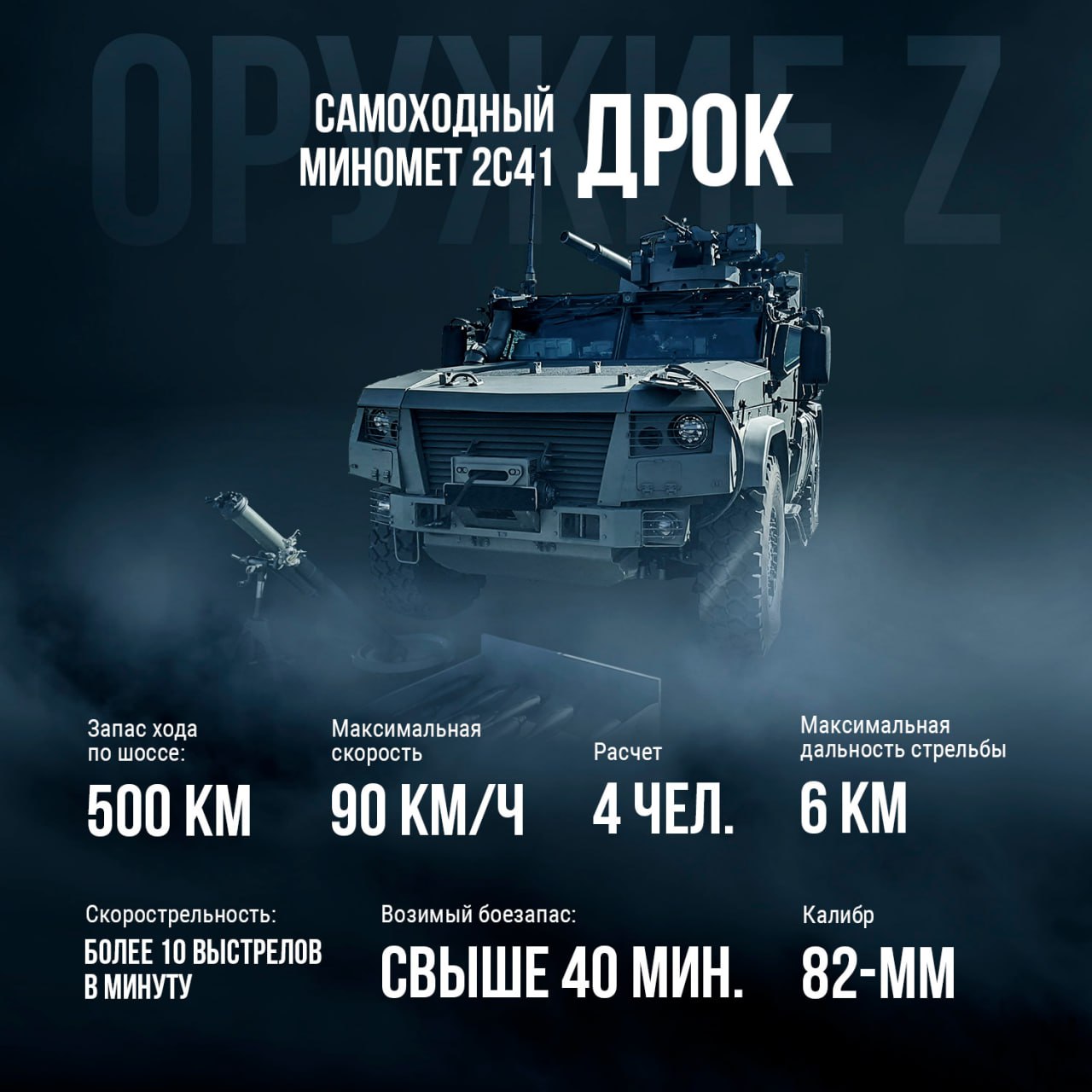 Прицельная дальность стрельбы 2С41 более чем в 1,5 раза выше штатных минометов 2Б14 «Поднос». «Дрок» оснащен дистанционно управляемым боевым модулем с пулеметом кругового вращения и оптико-электронным прицелом, а также дополнительным носимым минометом 2Б24, который может применяться пешим расчетом вне машины.