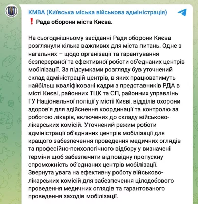 Власти Киева обсудили, как сделать мобилизацию в столице «непрерывной и эффективной», — сообщает официальная страница администрации.