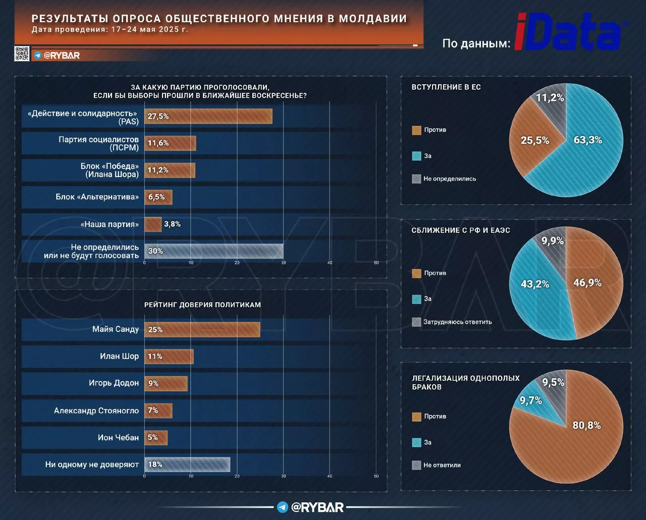 Молдавское общество по-прежнему поляризовано: большая часть одобряет ЕС, но весомая доля симпатизирует России даже на фоне пропаганды властей. Правящая PAS при наличии западной поддержки лишь условно лидирует. Хоть оппозиция фрагментирована, при создании коалиций она имеет серьезные шансы на выборах.