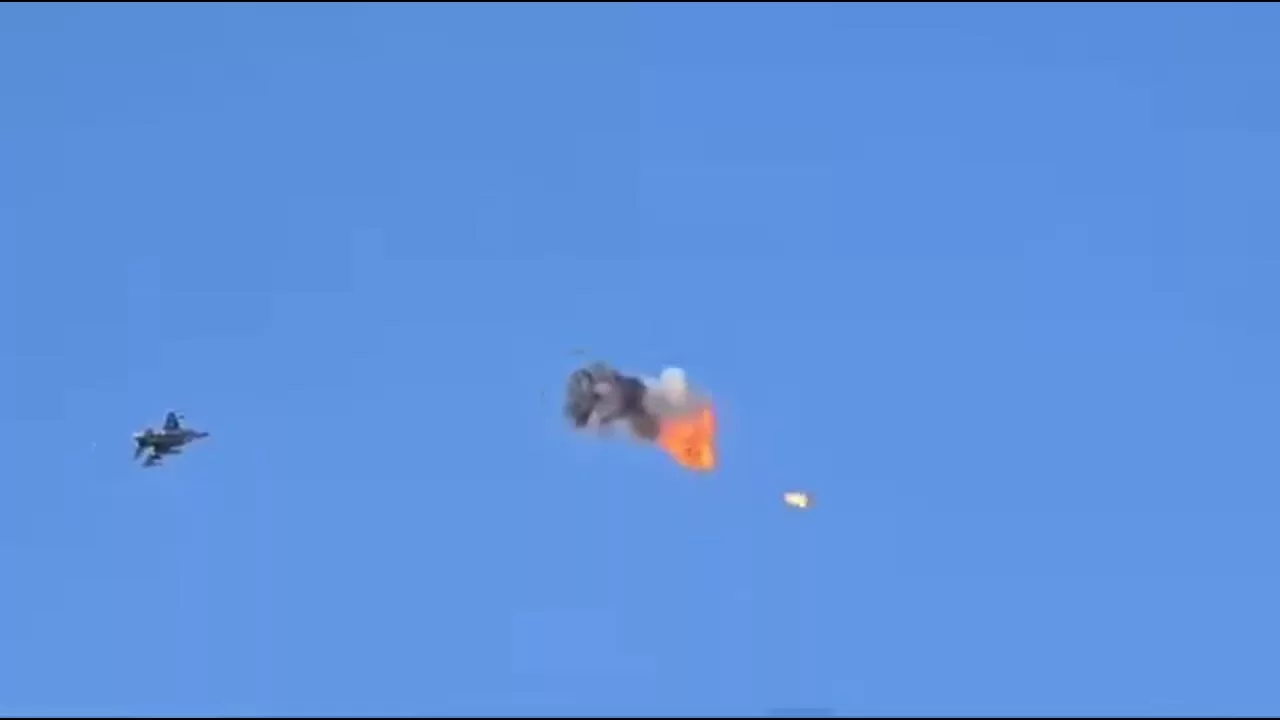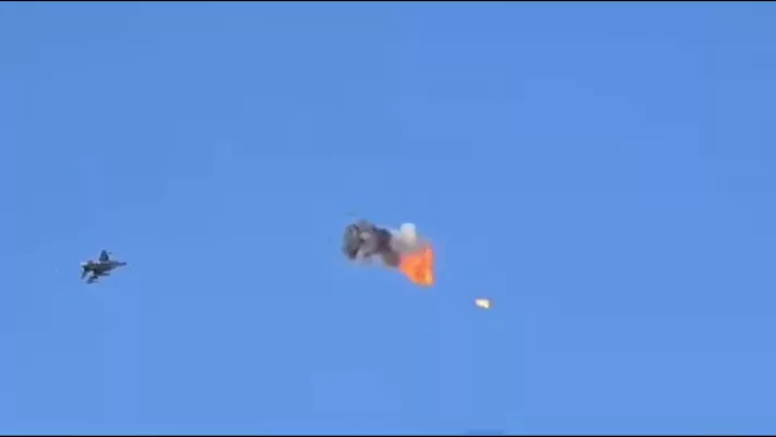 Обращает на себя внимание кинжальная дистанция поражения и последующий пролет истребителя через облако обломков сбитого дрона. Чем это может закончится мы знаем — например, в аналогичной ситуации украинский МиГ-29 просто разбился.