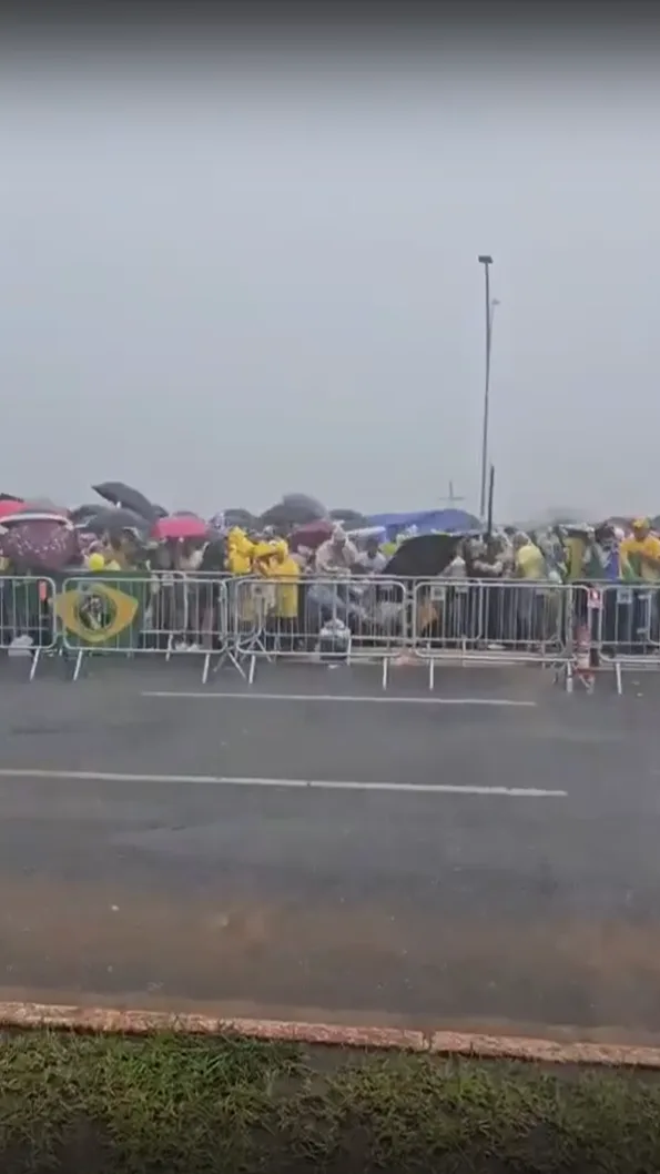 Люди собрались на акцию в поддержку экс-президента страны Жаира Болсонару, который отбывает тюремное заключение. Протестующие находились под зонтами на открытой местности и среди металлических ограждений.