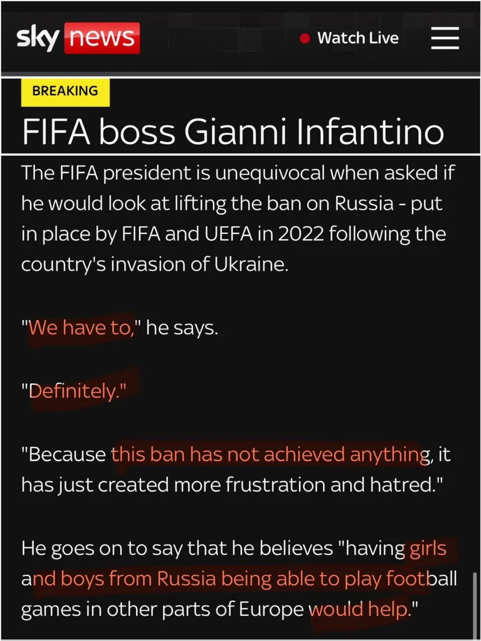 «Будущие поколения будут считать это позором, напоминающим события Олимпийских игр 1936 года», — добавил он в конце, сравнив возможное возвращение российских команд с олимпиадой Гитлера.