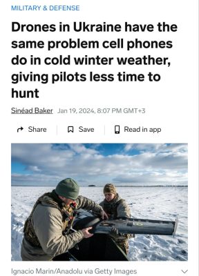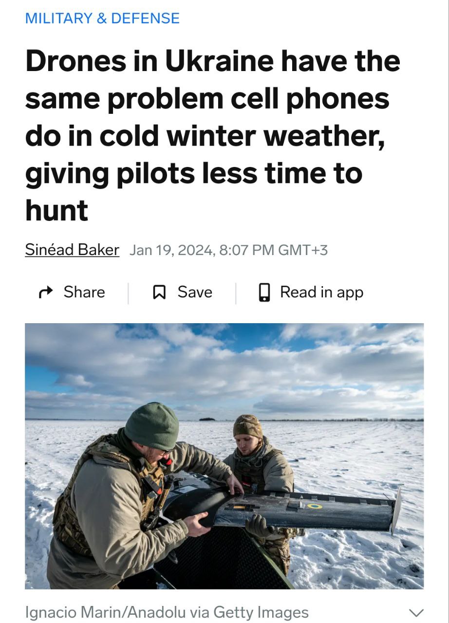 Украинская армия больше не может эффективно использовать дроны в зоне конфликта из-за низких температур и средств радиоэлектронной борьбы ВС РФ, пишет издание Business Insider.
