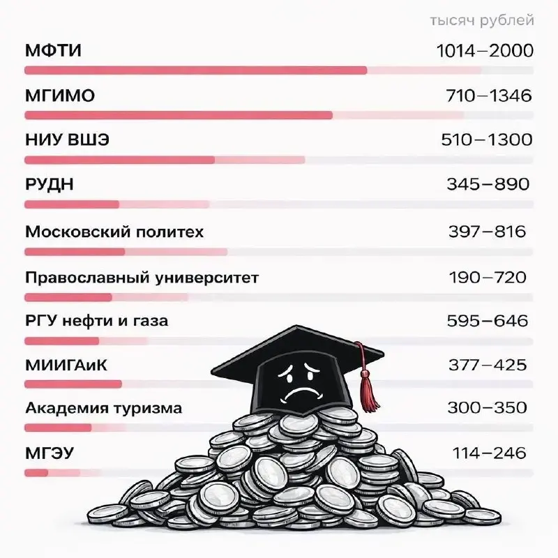 В МФТИ год обучения стартует примерно от 1 млн рублей, а на некоторых направлениях цена достигает 2 млн. В РГУ нефти и газа им. Губкина обучение стоит от 600 до 650 тысяч рублей в год в зависимости от направления.