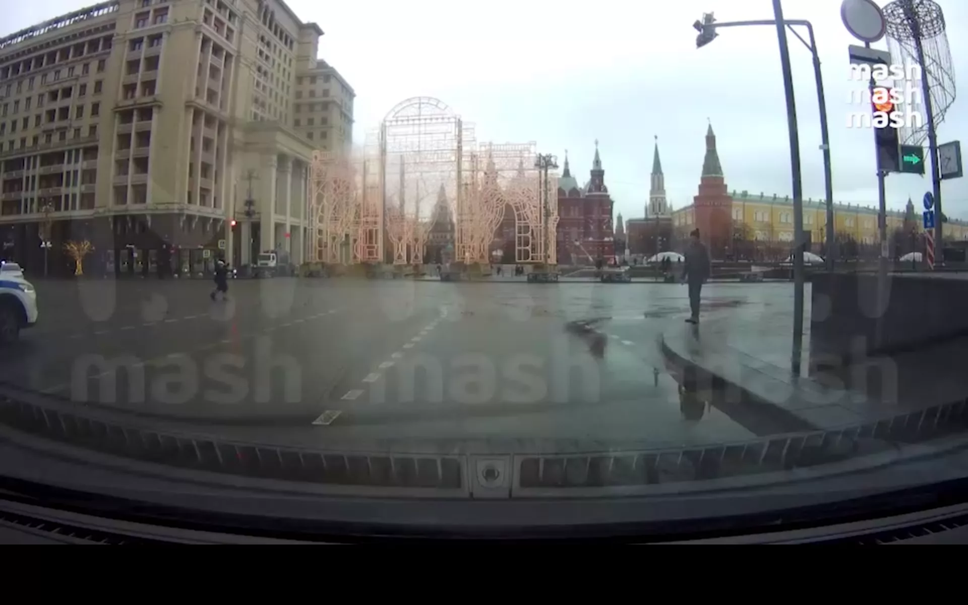 Всё случилось сегодня примерно в 9 утра на перекрытой Тверской улице. Мужчину в шапке быстро задержали — под блестящее музыкальное сопровождение из машины с видеорегистратором.