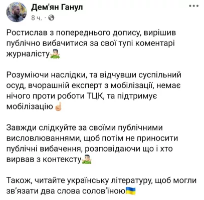 Позже на странице в соцсетях одесского скандального активиста Демьяна Ганула* появилось видео, где мужчина извиняется за свои слова и говорит, что выступает за мобилизацию.