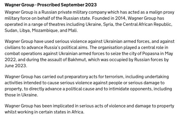📝 «Группа Вагнера осуществляла подготовительные действия к терроризму, в том числе осуществляла действия, направленные на причинение серьёзного насилия в отношении людей или серьёзного ущерба имуществу», — заявление британского МВД.