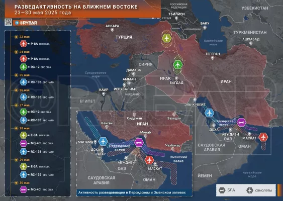 - Рост интенсивности разведывательных полётов с юга — над Персидским и Оманским заливами.