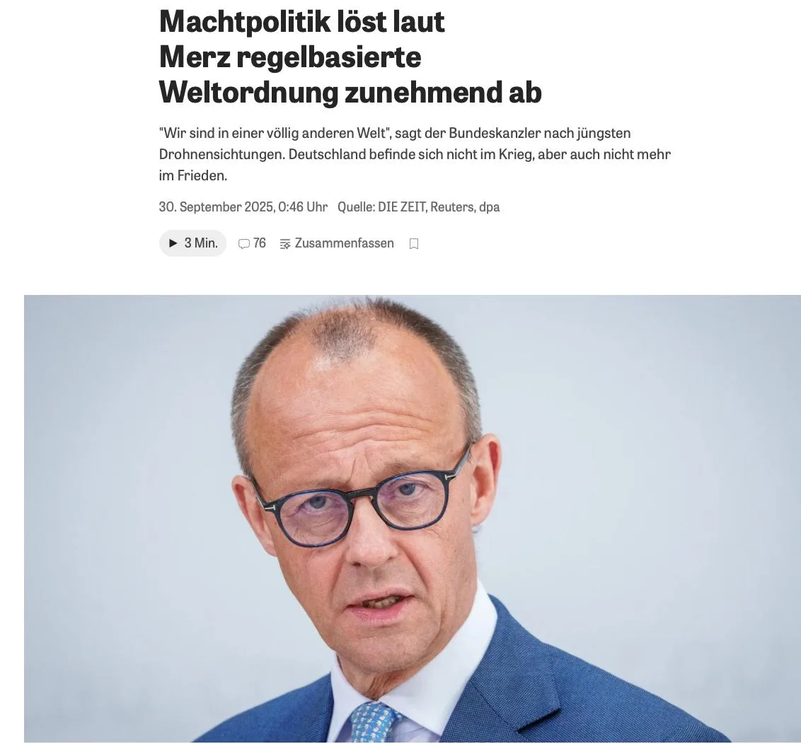 Канцлер Германии заявил, что страна «уже не живет в мире», хотя формально и не находится в состоянии войны. По его словам, Германия переживает «время фундаментальных перемен» и сталкивается с новыми угрозами – в том числе с участившимися полетами дронов.