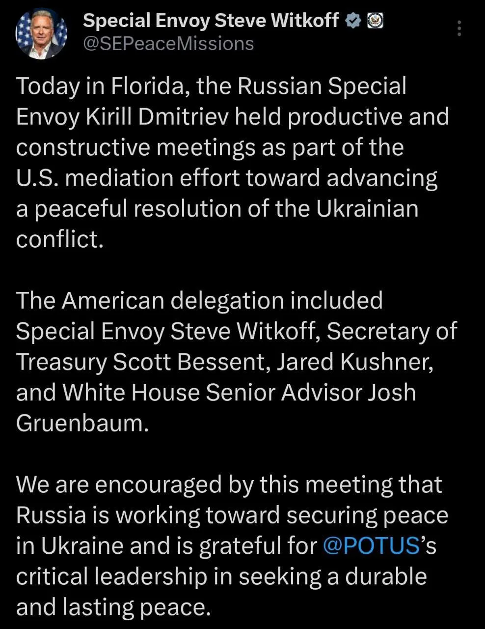«Мы воодушевлены этой встречей и тем, что Россия работает над обеспечением мира в Украине, и благодарны президенту США за его ключевое лидерство в стремлении к прочному и устойчивому миру», — заявил Уиткофф.