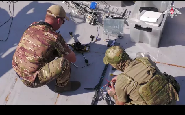 Для наработки практических навыков операторов FPV-дронов в ходе тренировки в качестве мишени использовался трофейный безэкипажный катер украинского производства «Магура».