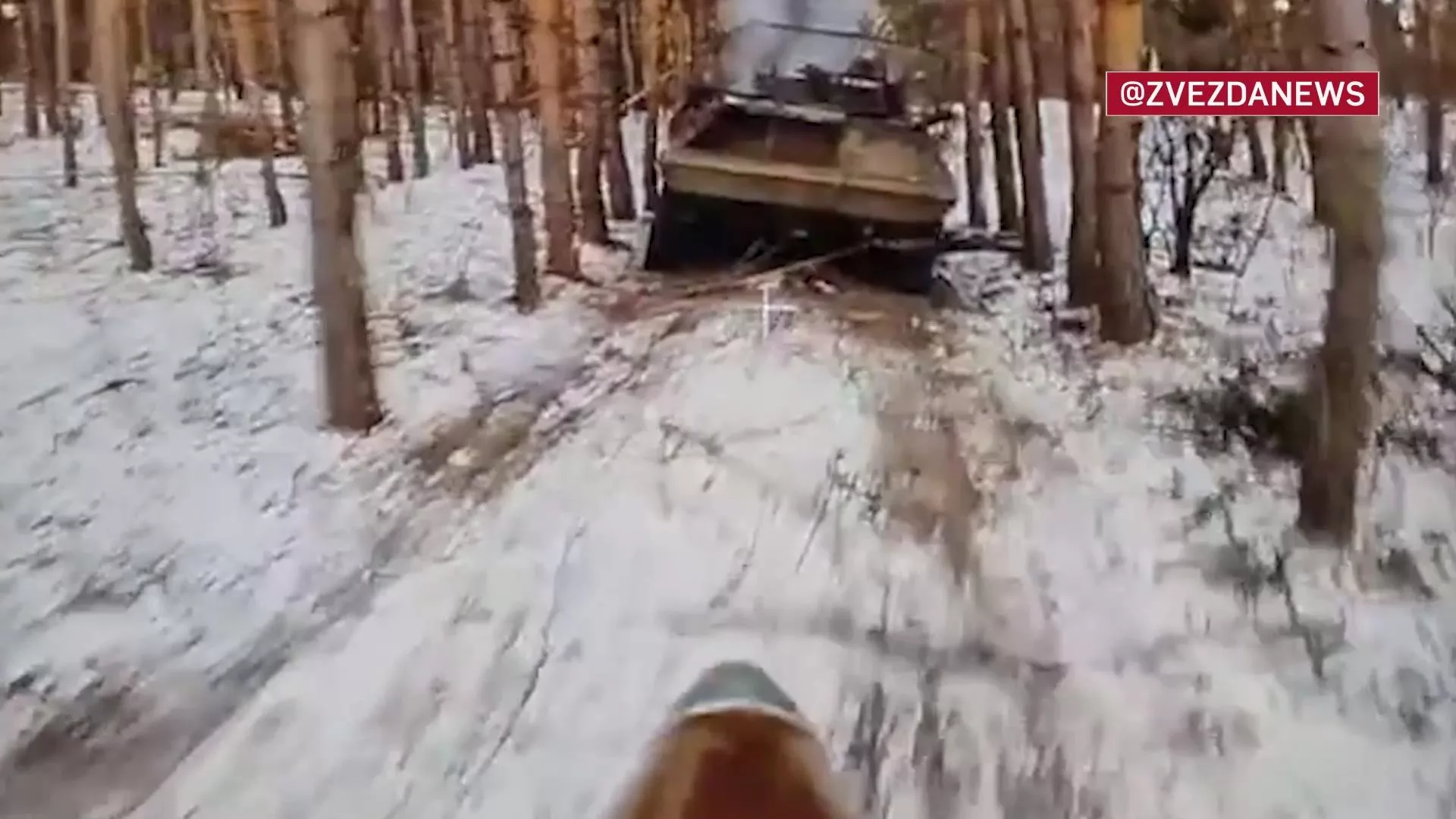 Противник попытался спрятаться среди деревьев, но все равно засветился в объективах разведчиков. Выждав подходящий момент, оператор беспилотника на оптоволокне вылетел на охоту за вражеской техникой.