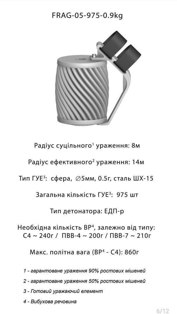 🔻Заряд FRAG-05, доставляется с помощью FPV дрона, либо сбрасывается с Бабы Яги. Особенность данного заряда: при падении над позицией, взрывается в воздухе на расстоянии 6-8 метров от земли, данный снаряд начинен до 2 кг. круглыми поражающими элементами (шариками), площадь поражения до 30 м.