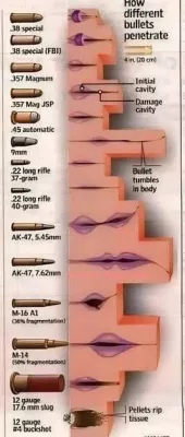 Более мелкие и медленные пули, такие как .22 калибра, оставляют небольшие входные и выходные раны, в то время как более крупные и быстрые пули, такие как .357 magnum, создают большую полость и наносят больше повреждений.