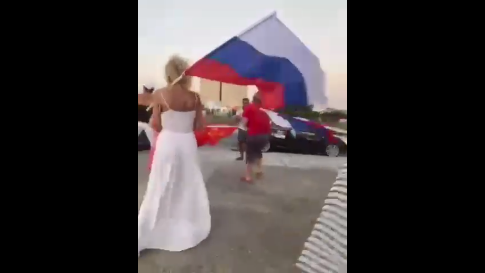 В распространённом по соцсетям ролике нападавшая держит в руках нож и, шатаясь, идет к небольшой группе людей с триколорами.