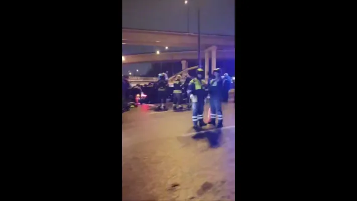 Mercedes рухнул с эстакады МСД на 77-м километре МКАД прямо на на другой автомобиль. Водитель и пассажир иномарки погибли на месте, остальные участники ДТП не пострадали.