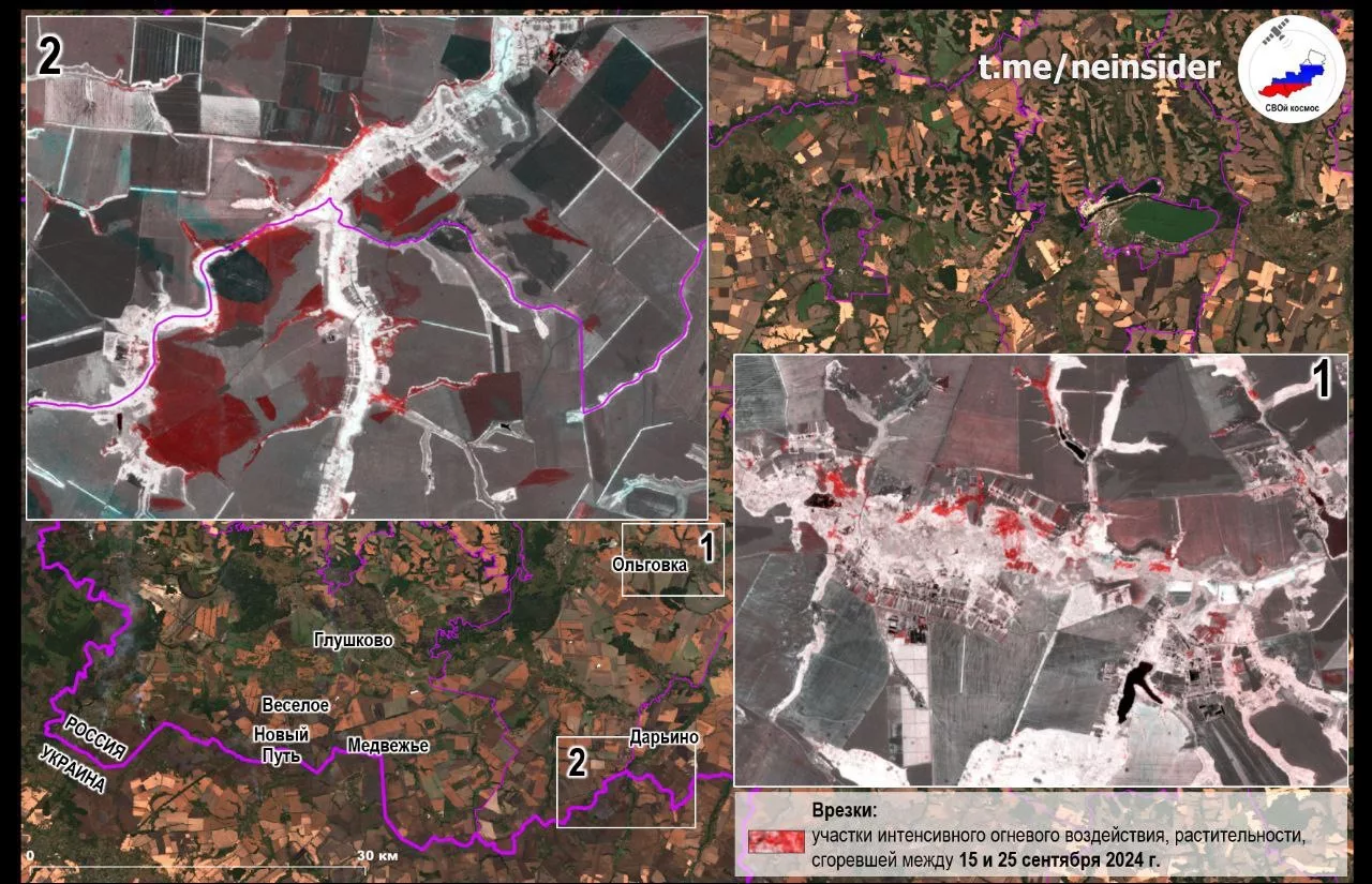 - серые и белые — участки с незначительными изменениями между съёмками (в основном естественная растительность);