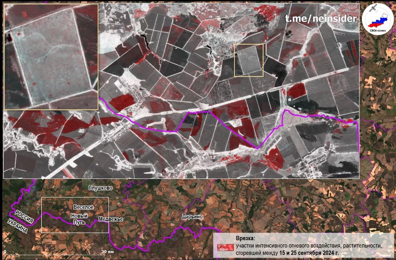 - красные участки — те, что за указанный период изменились больше всего (места прилётов, сгоревшие территории);