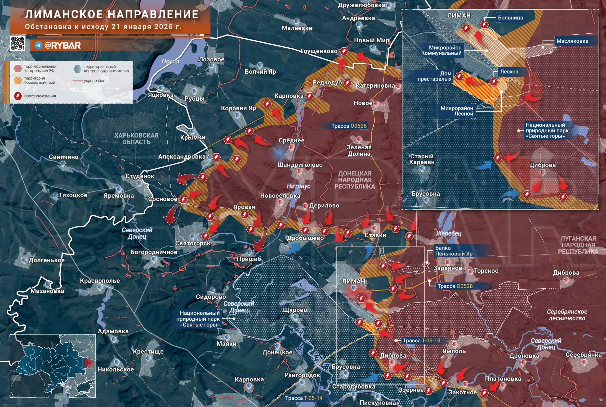 ➡️На северном фланге в треугольнике Сосновое — Святогорск — Яровая обстановка скрыта «туманом войны». Малые пехотные группы ведут бои на территории сразу трех населенных пунктов, однако отсутствие кадров и сведений с мест пока не позволяет провести точную линию соприкосновения.