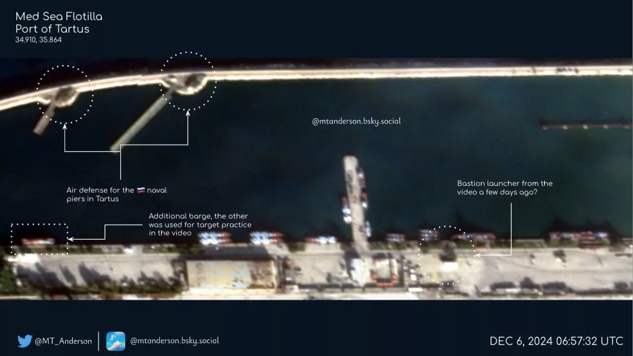 На самом пирсе по-прежнему развернуты ЗРК, в порту находится БРК «Бастион». В кадре отсутствует только фрегат «Адмирал Головко» и танкер «Ельня».