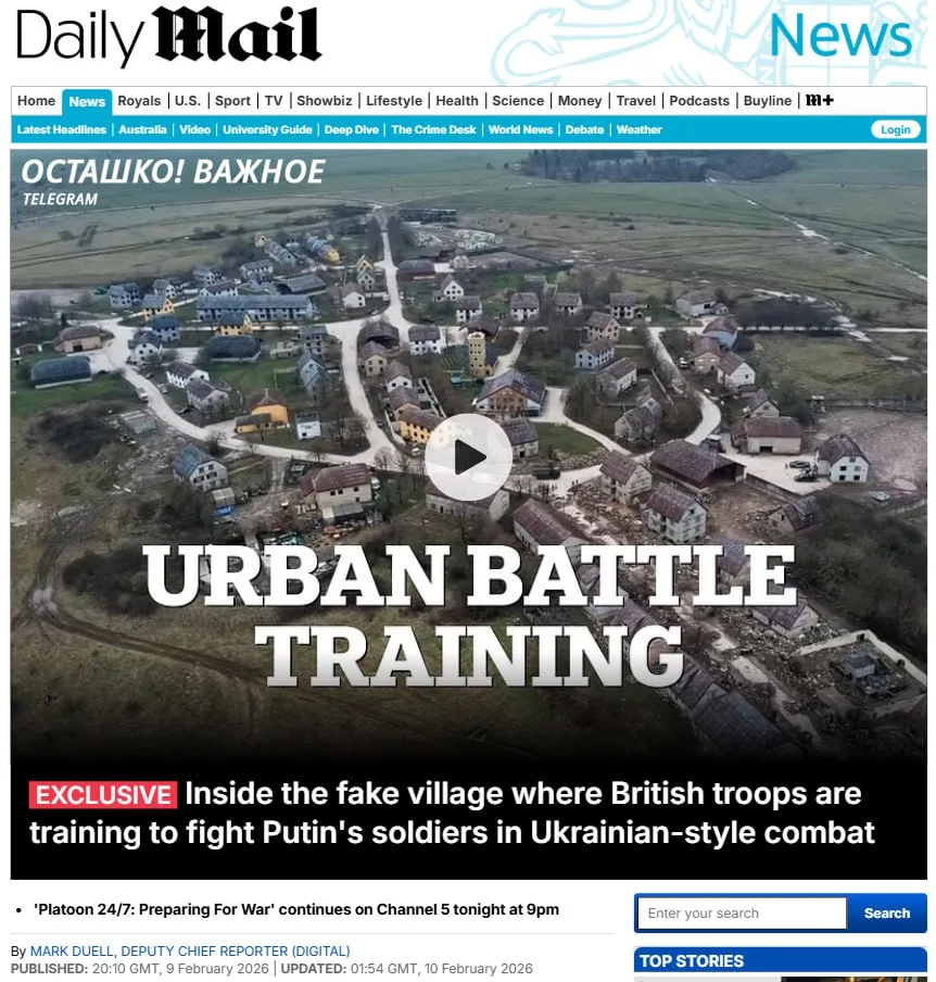 Daily Mail сообщает, что британская армия тренируется для возможного конфликта с Россией на полигоне Copehill Down — это искусственный «разбомблённый город», стилизованный под зону боёв на Украине. Там отрабатываются уличные штурмы, зачистка зданий, бои в подвалах и тоннелях.