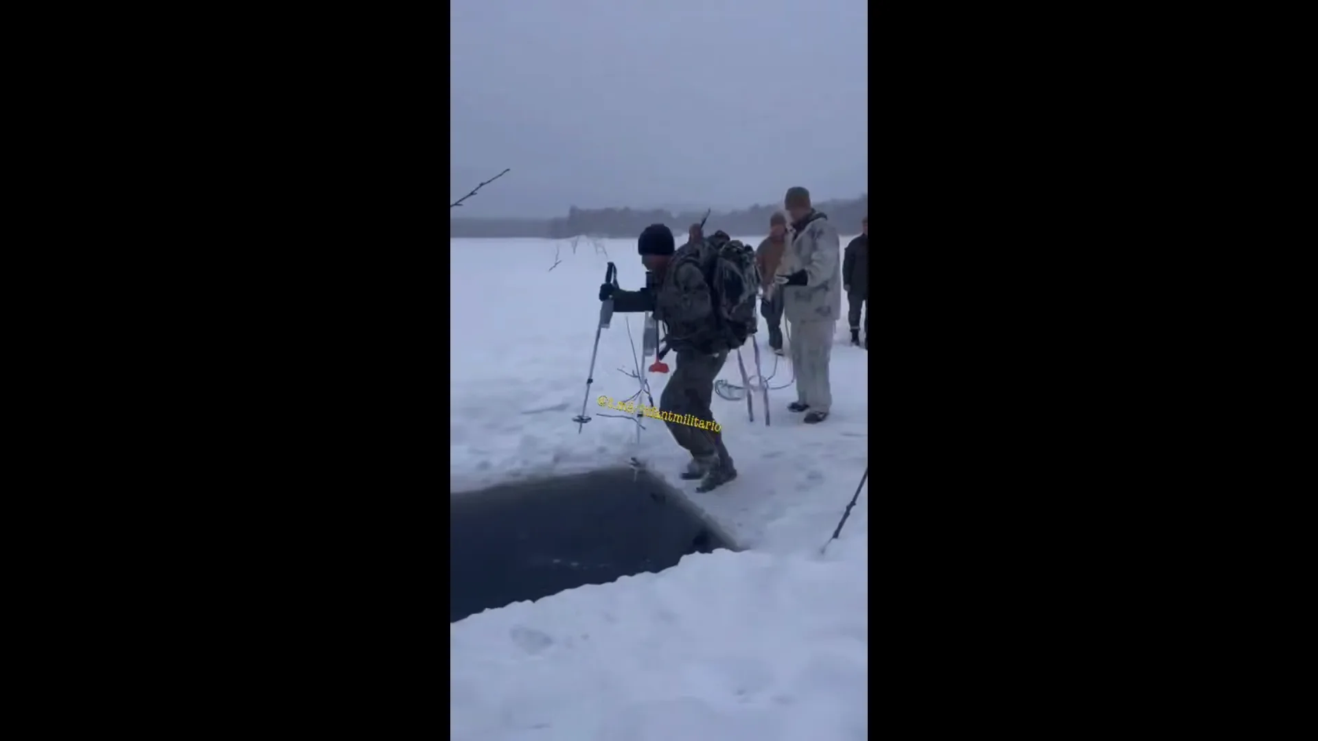Это упражнение отрабатывают, чтобы солдат мог выжить при провале под лёд в Арктике, в реальных условиях, с полной боевой экипировкой и без времени на раздумья.