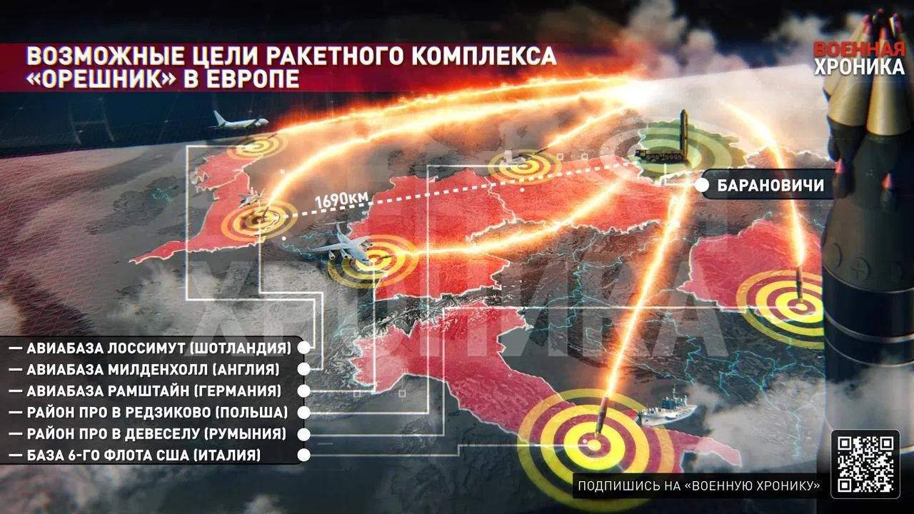 Словом, всё то, что при начале и развитии полномасштабного конфликта начнёт уничтожаться в первую очередь. Не лишним будет отметить, что «Орешник», как до него и другие советские БРСД, спроектирован с большим запасом по дальности, что позволяет размещать его где угодно и не только в Белоруссии.