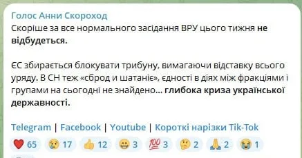 Депутат Рады Анна Скороход заявила, что полноценного заседания парламента на этой неделе не будет. Партия «Европейская солидарность» готовится блокировать трибуну и требует отставки всего кабинета министров.