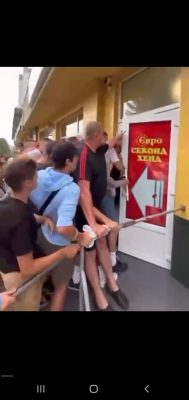 Женщины и мужчины дерутся и толкаются, лишь бы попасть в магазин.