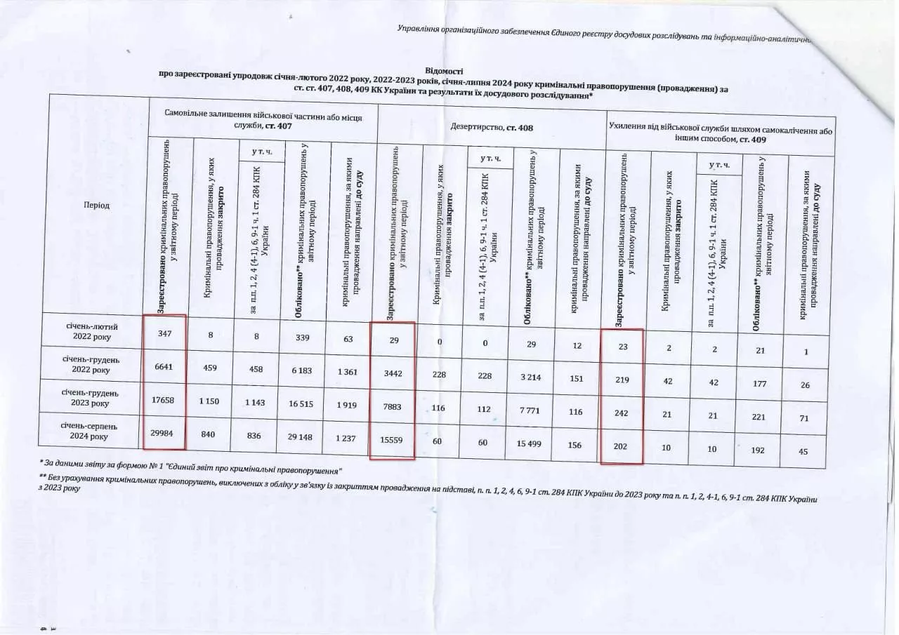 Согласно данным ОГП, за восемь месяцев 2024 года открыто 29 984 производства за самовольное оставление части, в то время как в 2022-м таких случаев было 6 641, а в 2023-м — 17 658.