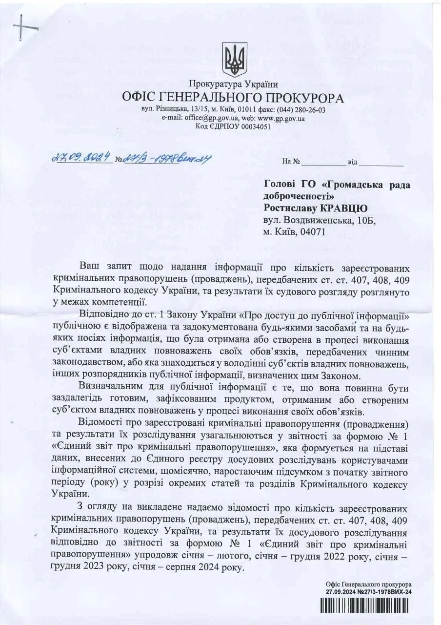 Об этом говорится в ответе Офиса генпрокурора на запрос «Общественного совета добропорядочности».