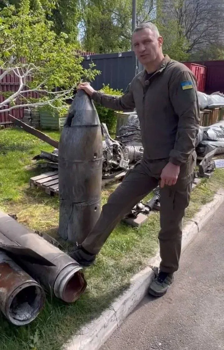 Ранее украинская сторона уже демонстрировала якобы боевые части «Кинжала». В частности, в мае 2023 года с ней позировал мэр Киева Виталий Кличко. Нынешнее же изделие, показанное ДСНС, как две капли воды похоже на ту «болванку» имени Виталика Кличко. Хорошо видно, что обе БЧ выполнены из материла, похожего на чугун. И судя по повреждения на их корпусах, –это точно не высокопрочный метал.