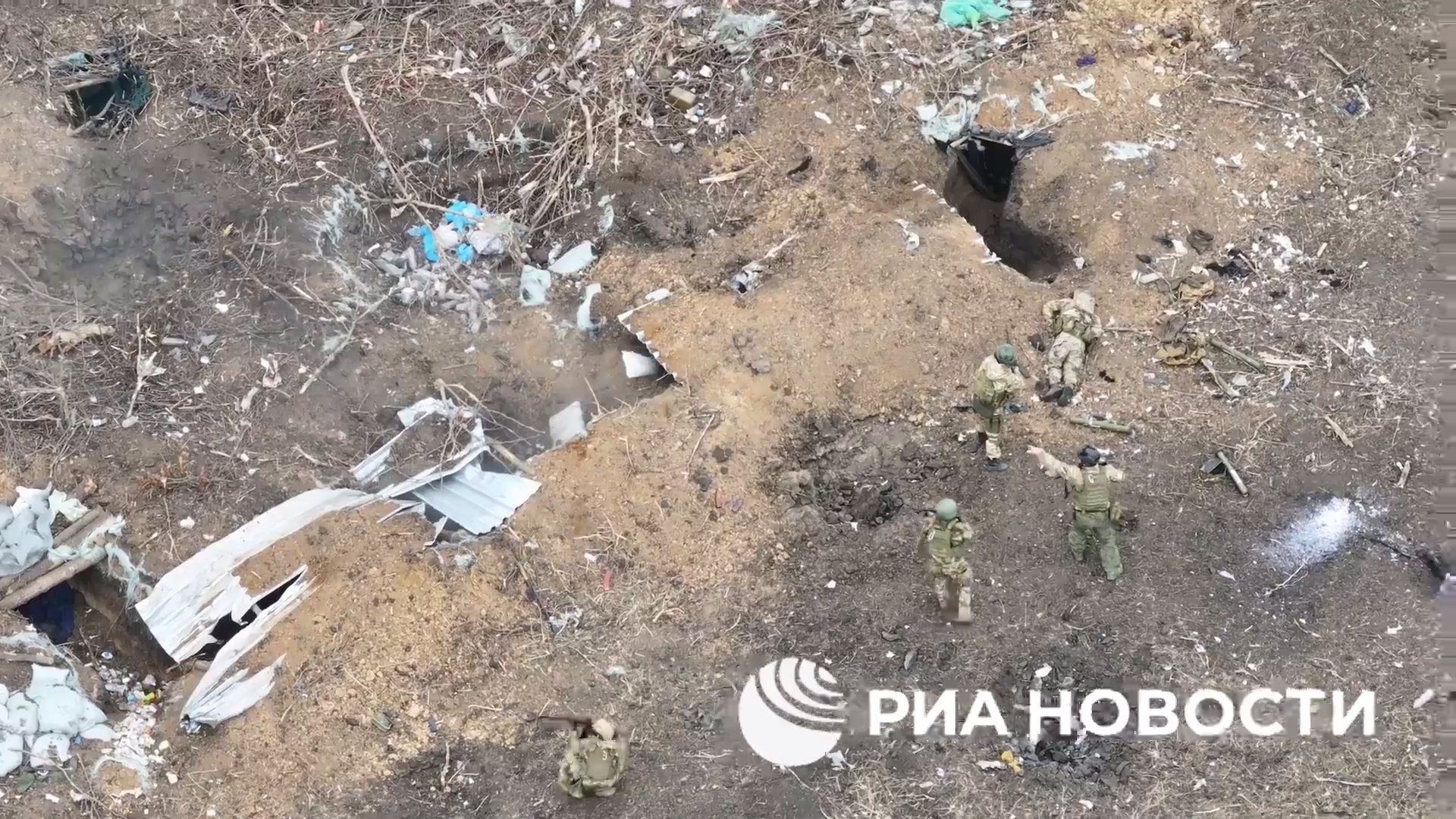 Кадры публикует Минобороны. На видео видно, как три укробоевика вылезают из укрытия, подняв руки, и ложатся на землю.