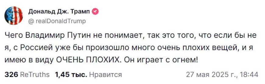 «Владимир Путин не понимает, что если бы не я, с Россией уже случилось бы много очень плохих вещей, и я имею в виду ОЧЕНЬ ПЛОХИХ. Он играет с огнем»