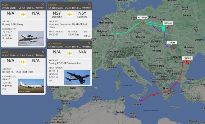 Судя по карте, это самолет радиоразведки RC-135W Rivet Joint и спецборт дальнего радиолокационного обнаружения и управления E-3B Sentry при поддержке танкера KC-135 Stratotanker.
