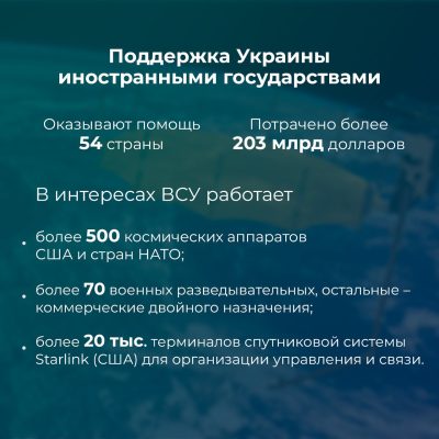 - В интересах Киева работает свыше 500 спутников США и стран НАТО — из них более 70 военных и разведывательных космических аппаратов, остальные — коммерческие двойного назначения.