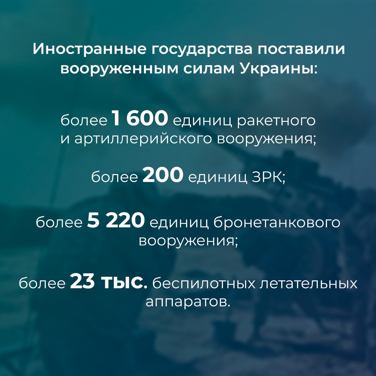 - Иностранные государства поставили ВСУ свыше 1600 единиц ракетного и артиллерийского вооружения, более 200 единиц зенитных ракетных комплексов, более 5200 единиц бронетанкового вооружения и свыше 23 000 беспилотников.